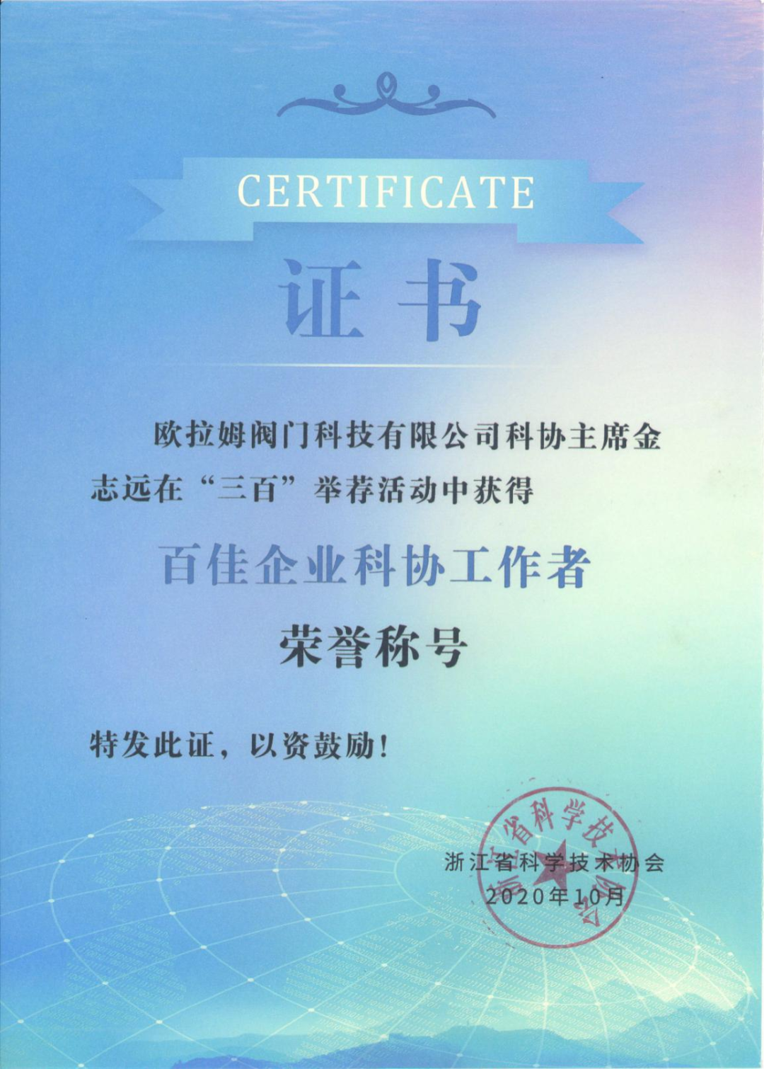 3月19日下午,溫州市科協(xié)十屆五次全會舉行。會上,歐拉姆公司董事長金志遠(yuǎn)被浙江省科學(xué)技術(shù)協(xié)會授予“百佳企業(yè)科協(xié)工作者”榮譽稱號。