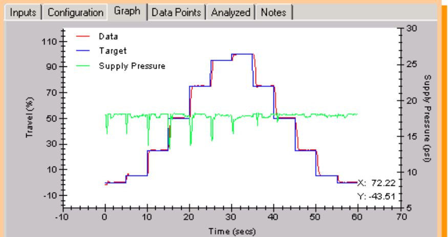 判斷閥門對(duì)輸入信號(hào)的響應(yīng)能力,分析數(shù)據(jù)如死區(qū)和超調(diào)等,以判斷閥門是否處于最佳控制狀態(tài),以及閥門的控制精度,并提供開關(guān)時(shí)間和T63、T86等響應(yīng)分析。